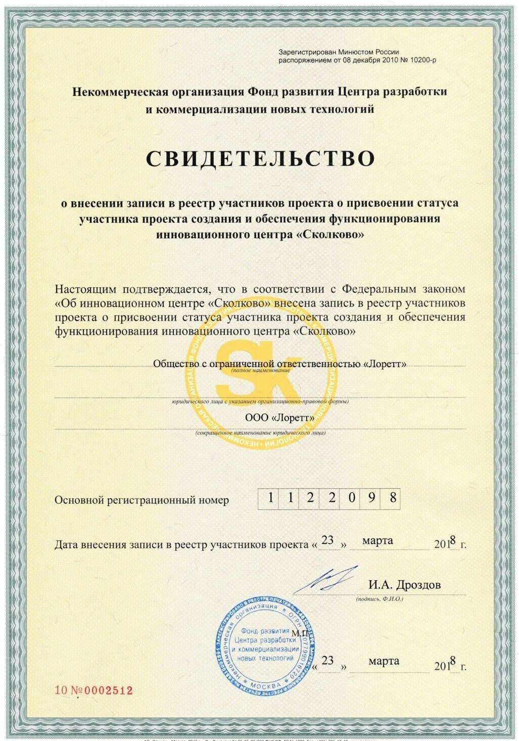 Свидетельство о резидентстве Фонда Сколково